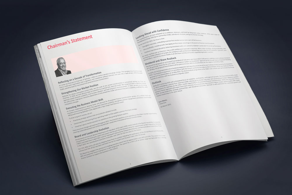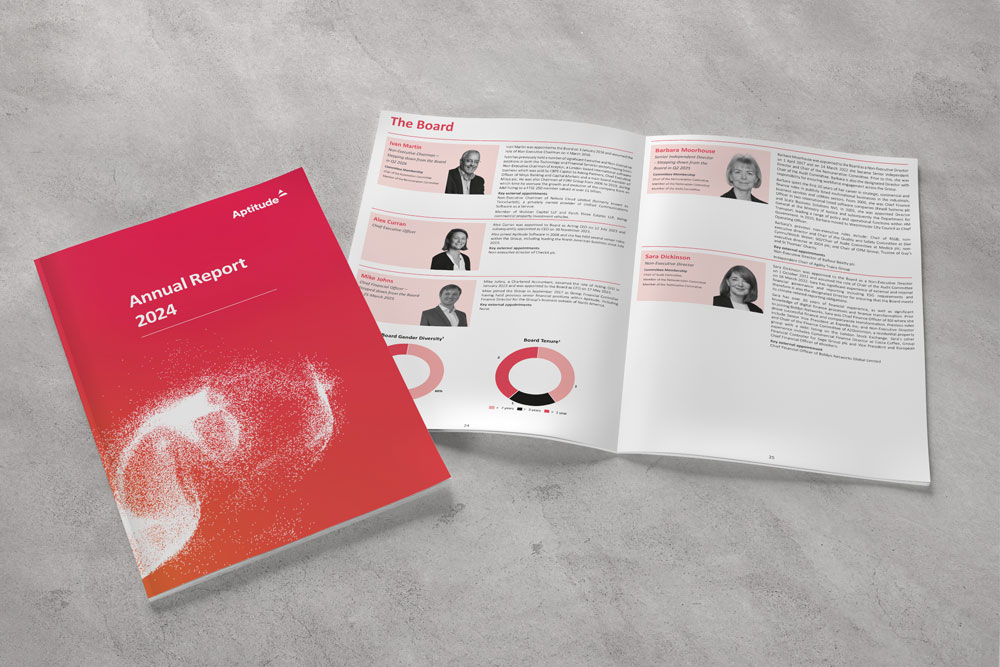 B&C’s design for Aptitude Software’s annual report features a clean, corporate-focused design that emphasizes clarity and accessibility for investors and stakeholders.