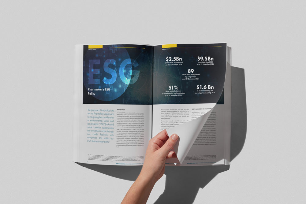B&C came up with a dynamic design for the annual report to emphasise the company’s market-leading position, established track record, size and consistent performance. The use of striking imagery to help investors visualise the more technical elements of the company’s investments, alongside clean typography, and considered use of colours white space, all help convey the company’s professionalism and reinforce its emphasis on sustainable investing and its credibility in the life sciences debt space.