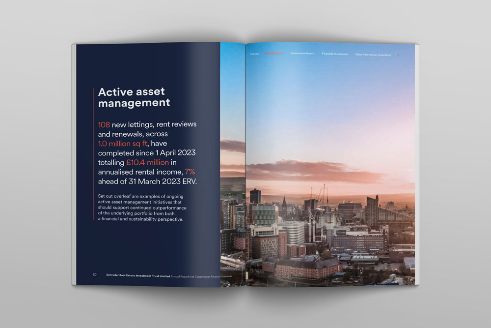 Schroder REIT’s annual report uses a structured, investor-focused layout designed to present complex property and financial information in a clear and logical sequence. The document follows a well-defined hierarchy, moving from strategic overview and market context through to portfolio performance, asset management activity, and detailed financial statements.